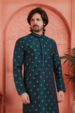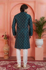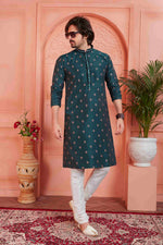 Raivat Ethnic Men's Jacquard Silk Brocade Pintux Work Kurta Pyjama In Teal Blue Colour - 34