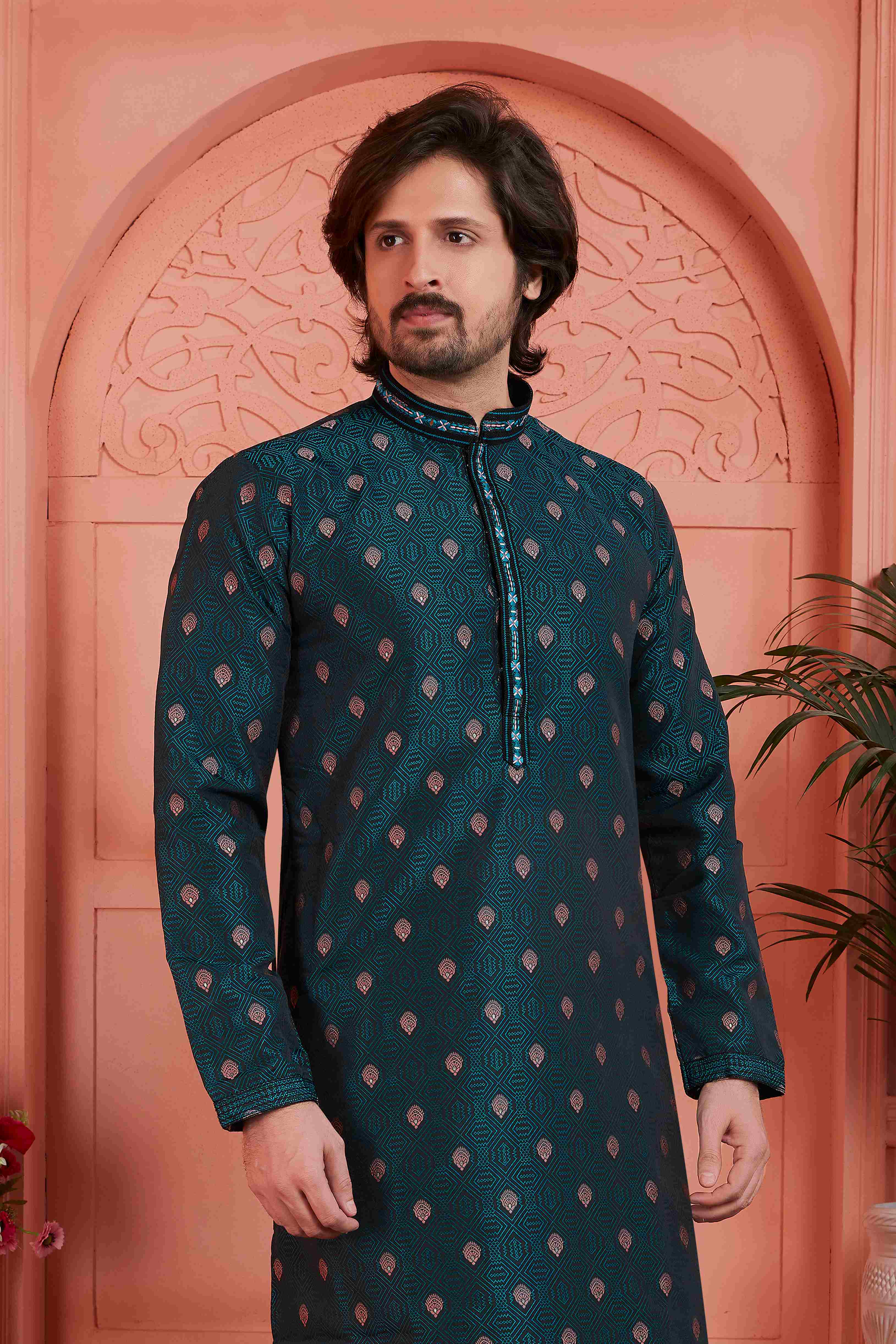 Raivat Ethnic Jacquard Silk Brocade Pintux Work Kurta Pyjama In Teal Blue ColourAbout The productEnhance your traditional wardrobe with this stylis...