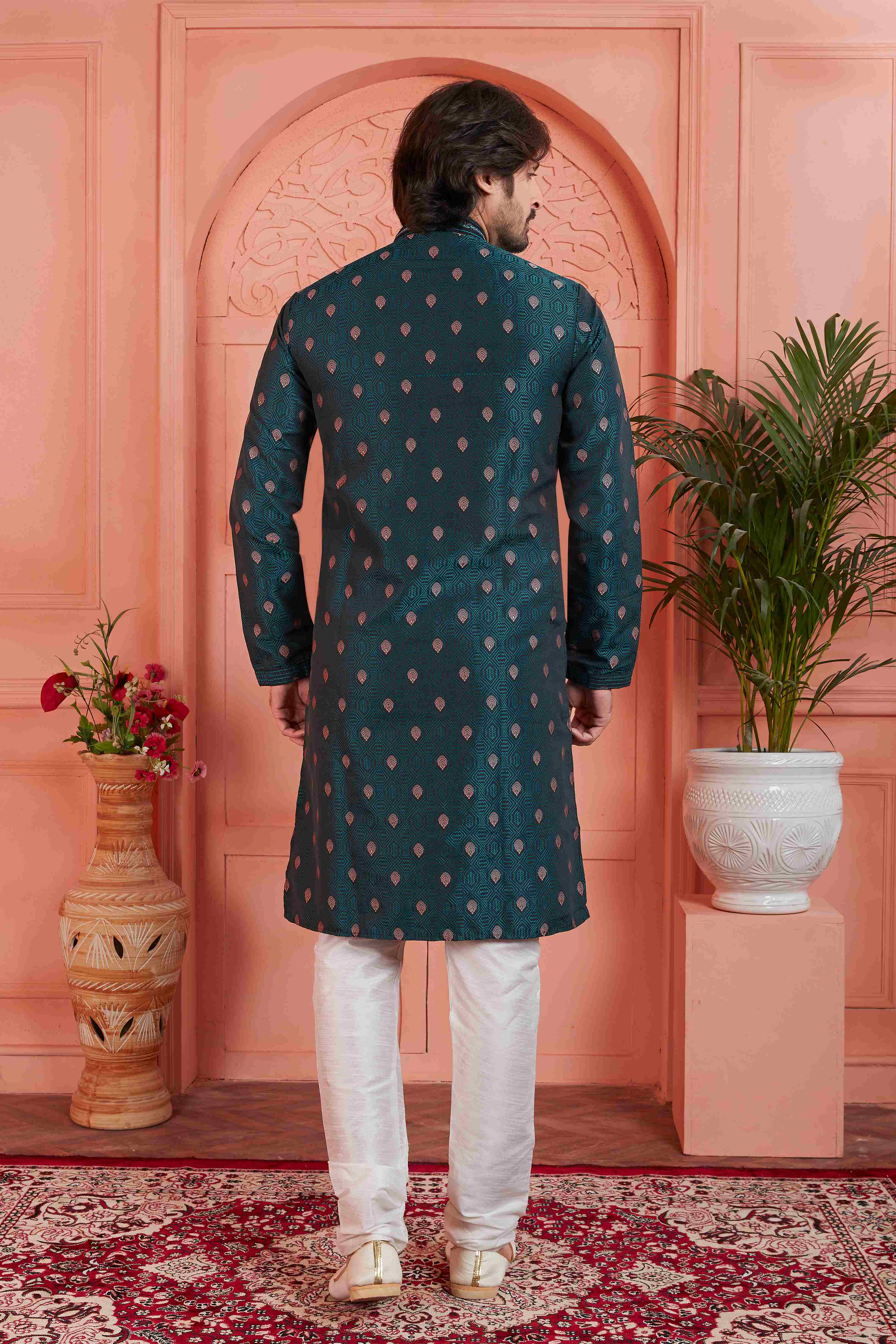 Raivat Ethnic Men's Jacquard Silk Brocade Pintux Work Kurta Pyjama In Teal Blue Colour