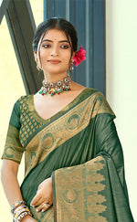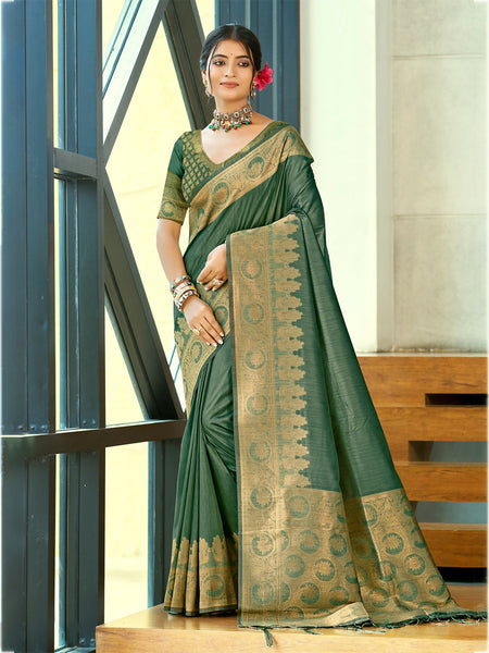 Sangam Prints Dark Green Assam Silk Woven Work Traditional SareeAbout the product:SANGAM PRINTS brings to you this saree which is made from Linen f...