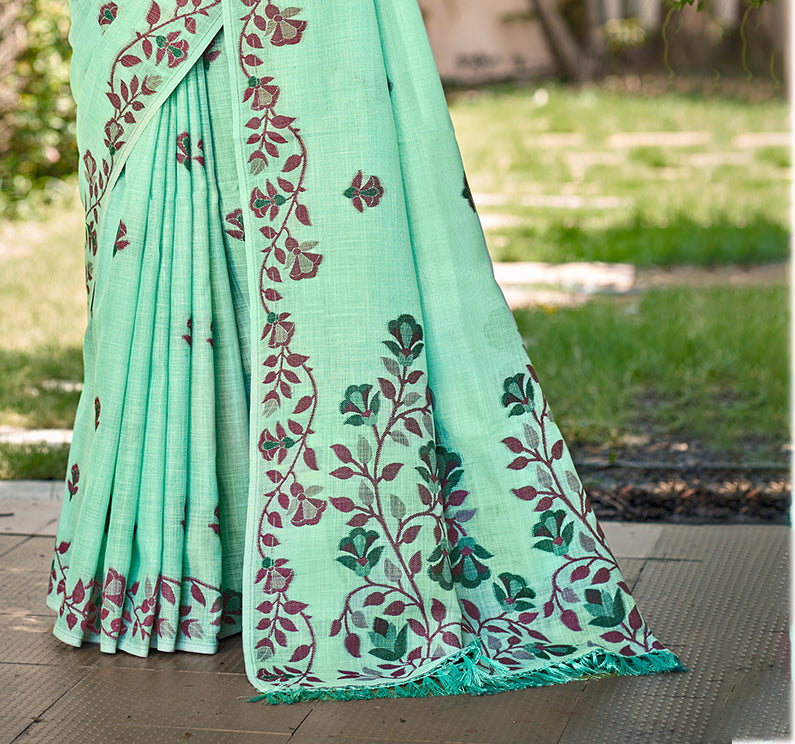 Sangam Prints Mint Green Linen Woven Work Traditional Saree - Free Size