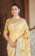 Sangam Prints Mustard Linen Woven Work Traditional Saree - Free Size