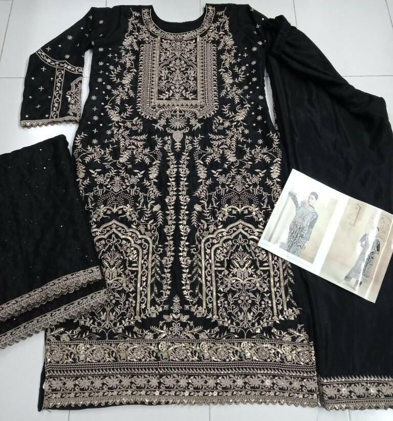 The Black Chinon Silk Embroidered Sequins Pakistani Straight Pant Suit is a stunning ensemble perfect for making a statement at various festive and celebratory events. Crafted from luxurious Chinon silk fabric this outfit is known for its smooth texture lightweight feel and subtle sheen. Chinon silk with its soft drape adds an elegant flow to the attire making it comfortable yet glamorous ideal for long hours of wear during festive occasions or parties.