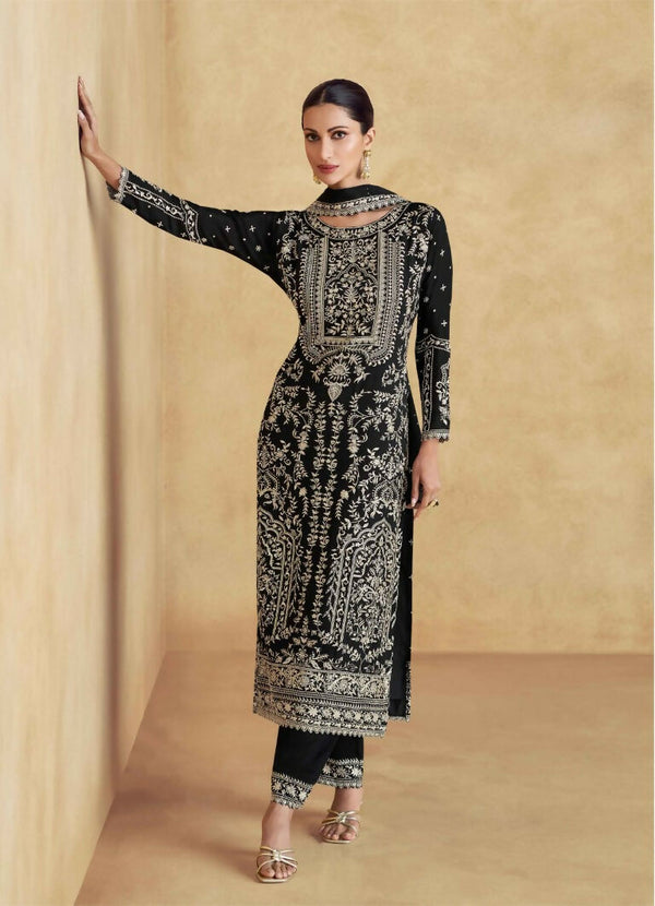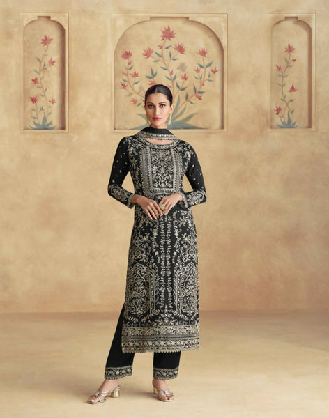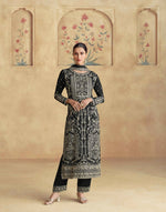 Vastranavya Black Chinon Silk Embroidered Sequins Pakistani Straight Pant Suit - Uo to 44" Free Size Stich