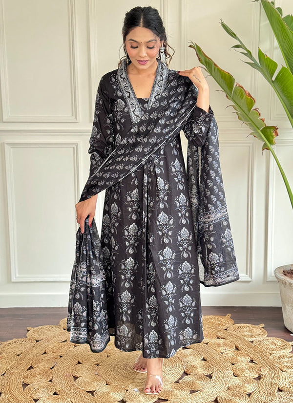 Vellora Cotton Black Casual Wear Printed Readymade Anarkali Suit