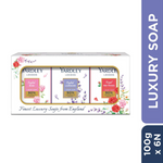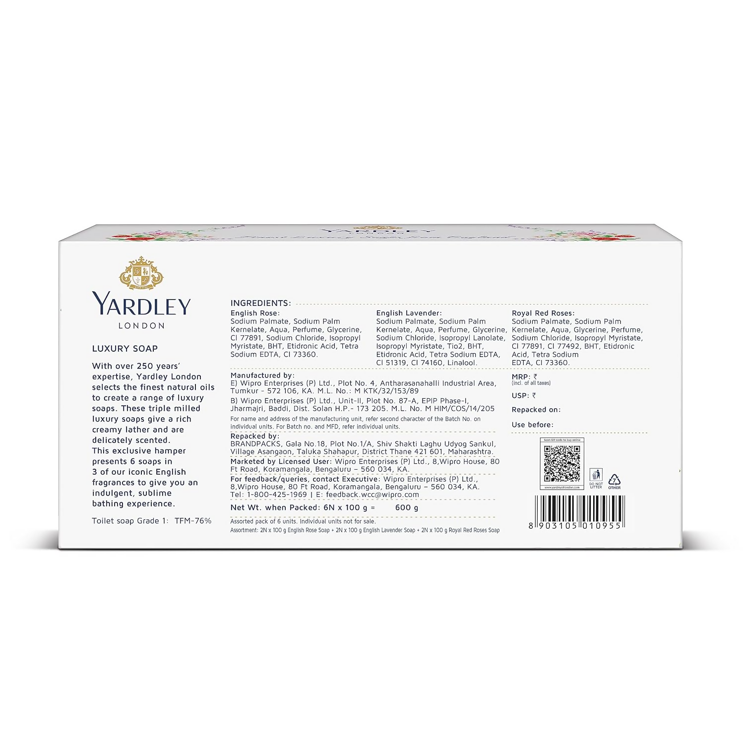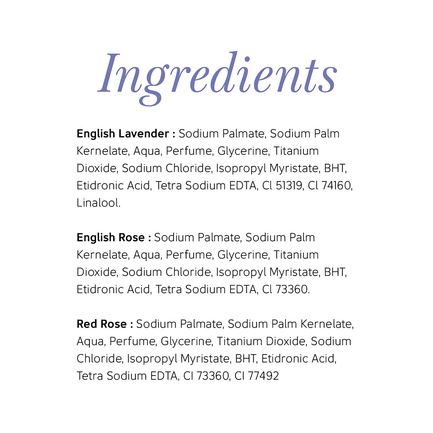 Yardley London Luxury Soap Assorted Pack, featuring the English Lavender, English Rose, and Royal Red Roses soaps. The English Lavender soap turns your daily bath into a royal pampering session, leaving your skin irresistibly soft with its soothing lavender oils. The English Rose soap is like a luxurious time machine, bringing the elegance of English roses to your daily routine with its rich, creamy lather. And for the woman who loves a touch of passion, the Royal Red Roses soap is a love story in a bar, with an intoxicating scent of royal red roses that's both floral and warm.Ingredients: