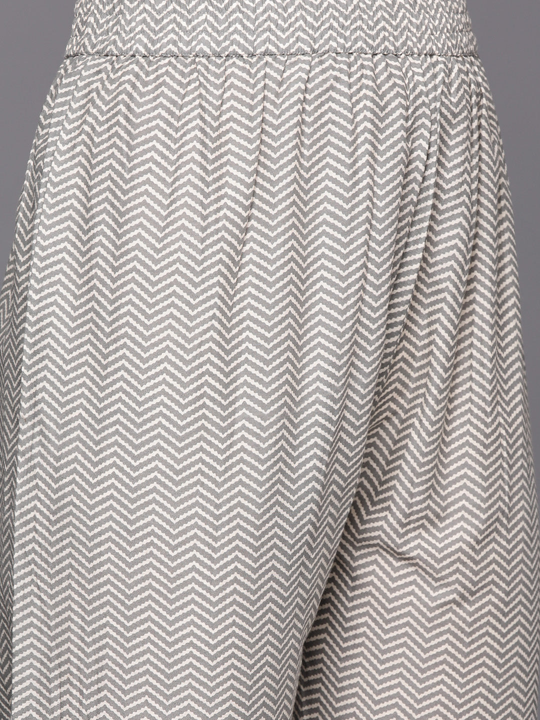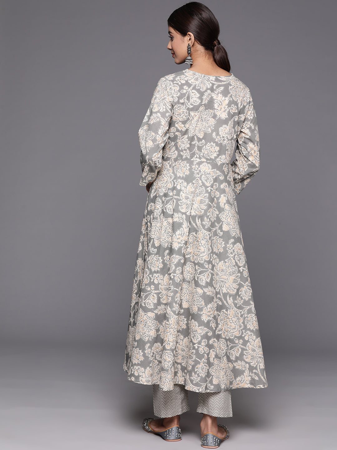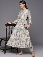 Grey Floral Printed Angrakha Style Anarkali With Gota And Drawstring Detail, Three Quarter Sleeves Paired With Tonal Chevron Printed Bottom.