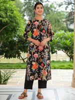 Aramya Straight Soft Cotton Floral Print Women's Kurta Set - Black