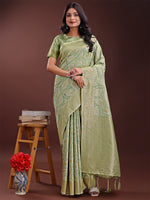 Astita Light Green Linen Cotton Saree with Golden Zari Leaf Design & Elegant Pallu - Festive | Office | Daily Wear - Distacart
