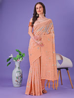 Astita Peach Lichi Silk Saree with Floral Weaving & Tassel Pallu - Elegant Festive & Party Wear Saree - Distacart