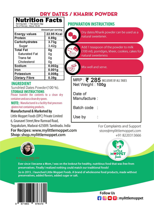 Little Moppet Foods Dried Dates - Kharik PowderIngredients: Sun Dried Dates Powder.How to use:Add 1 teaspoon of the powder to milk, porridges, khee...