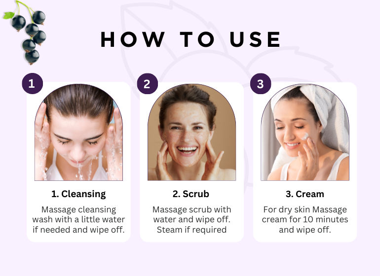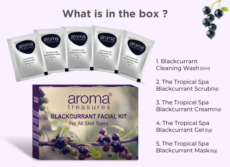 Aroma Treasures Blackcurrant Facial KitAbout the Product: How to Use: Massage cleansing wash with little water for 5 mins and wipe off. M...
