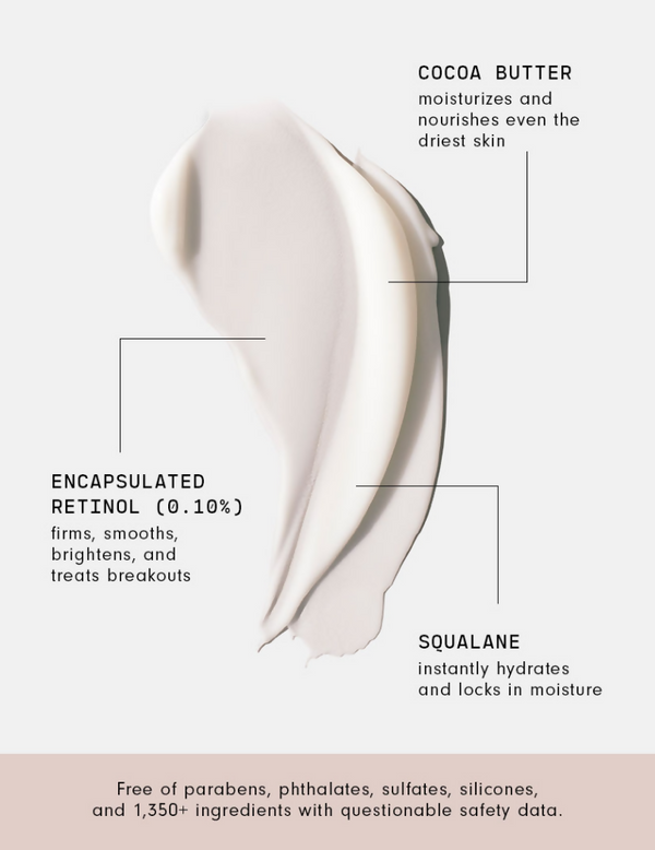 With pure retinol, nourishing cocoa butter, and moisture-replenishing squalane, this body lotion repairs more than dryness. It helps firm skin, smooth texture, brighten dullness, and even treat body breakouts (including the dark spots they leave behind). Encapsulated retinol gently renews skin, while the moisture-locking ingredients relieve dryness. The lightweight formula won't leave you feeling greasy, but it will deliver the retinol results you love for your face everywhere else.
