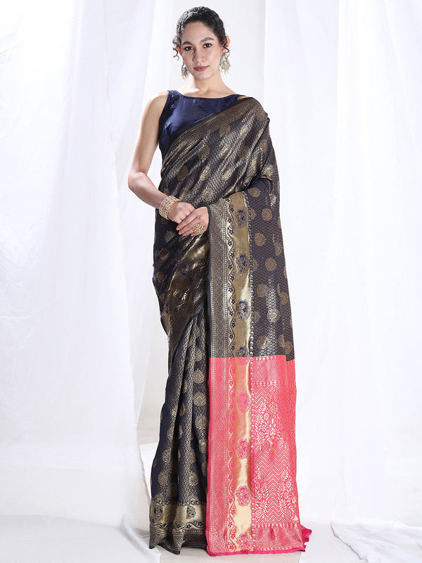 Janasya Navy Blue Silk Blend Ethnic Motifs Jacquard Saree