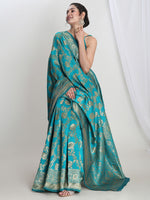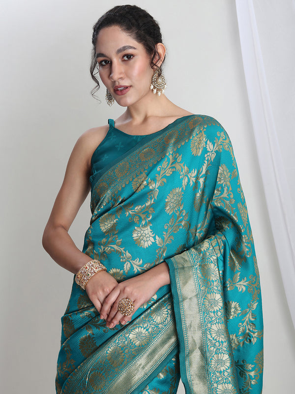 Janasya Teal Blue Silk Blend Floral Jacquard Saree