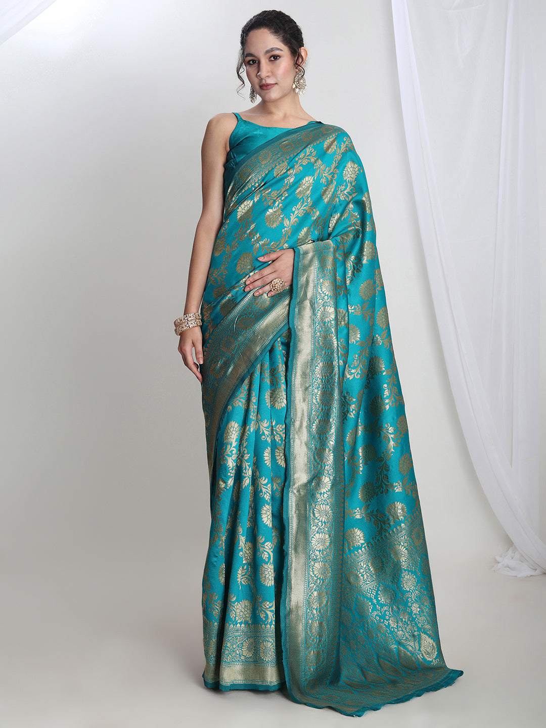 Janasya Teal Blue Silk Blend Floral Jacquard SareeAbout the Product: Saree Color: Teal Blue Saree Fabric: Silk Blend Saree Pattern: Floral Legal...