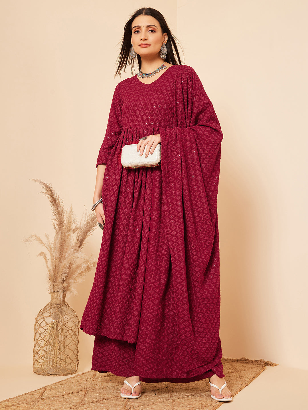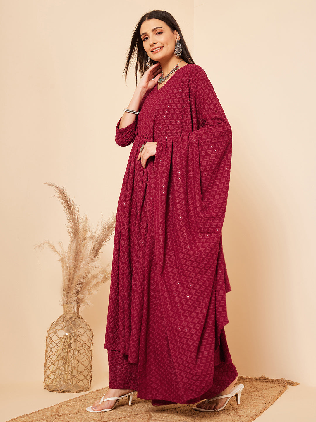 Inweave Women's Maroon Chikankari Long Anarkali Kurta Palazzo Set W DupattaThe Set is crafted from best of Indian fabrics. Style it with Oxidised j...