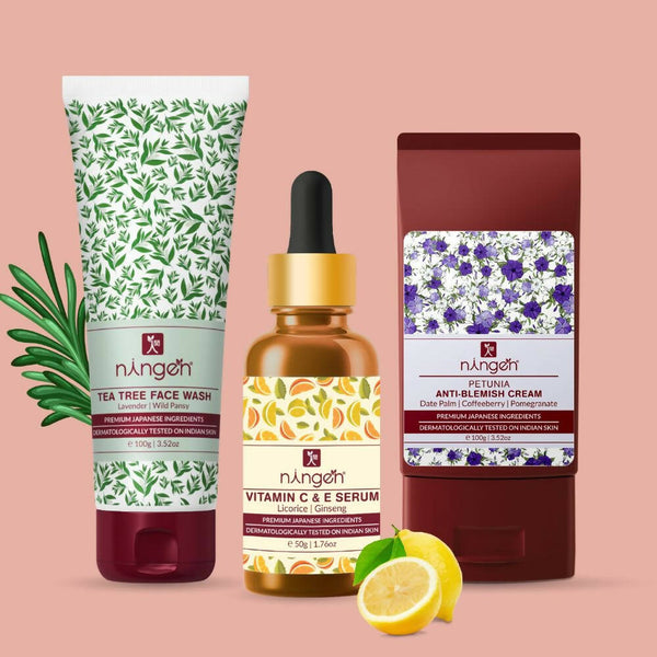 Ningen Glow Me Up Kit is a comprehensive skincare package designed to revitalize your skin. This kit includes a potent Vitamin C & E serum for brightening and nourishing, a Tea Tree Face Wash for deep cleansing and stopping acne, and the Petunia Anti-Blemish Radiance Cream to target and reduce blemishes. This combination of products is thoughtfully curated to promote a radiant and clear complexion, making it an ideal addition to your daily skincare routine.