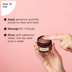 • Apply on damp skin twice a week. Massage in gentle circular motions following the contours of the face. Rinse with lukewarm water and pat dry.