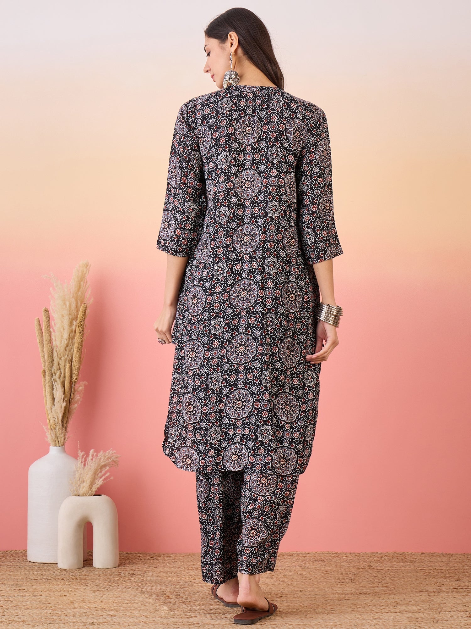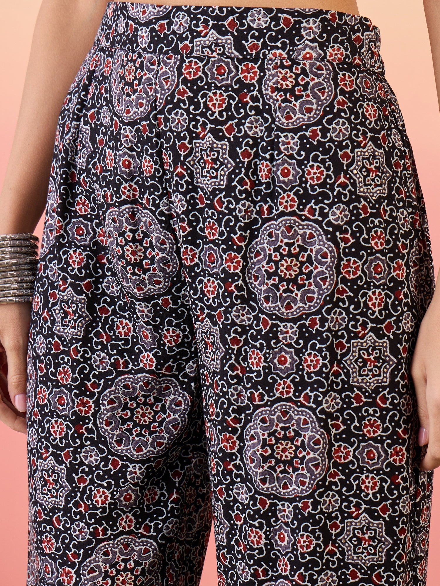 InWeave Black Maroon Ajrakh Foil V Neck Flared Kurta Pant SetThe Set is crafted from best of Indian fabrics. Style it with Oxidised jewelery and ju...