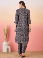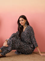 InWeave Black Maroon Ajrakh Foil V Neck Flared Kurta Pant Set