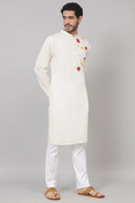A cotton kurta with floral embroidery patch embellishment is a garment crafted from cotton fabric and adorned with separate floral embroidery patches. These patches, featuring floral motifs, are intricately designed and then attached to the kurta's fabric, creating a decorative and stylish look. This embellishment adds a touch of elegance and sophistication to the cotton kurta, making it suitable for various occasions, from casual gatherings to semi-formal events, while combining comfort with ornate detailing.