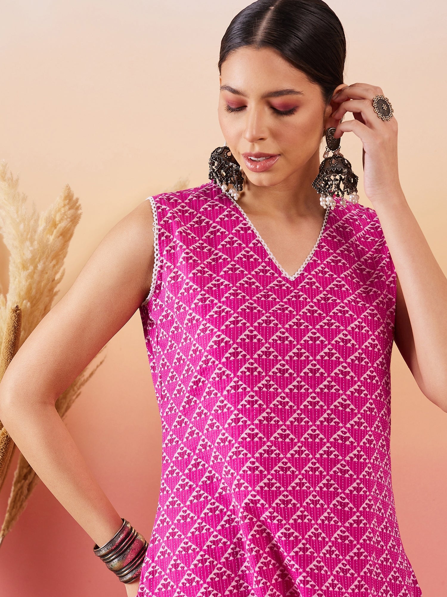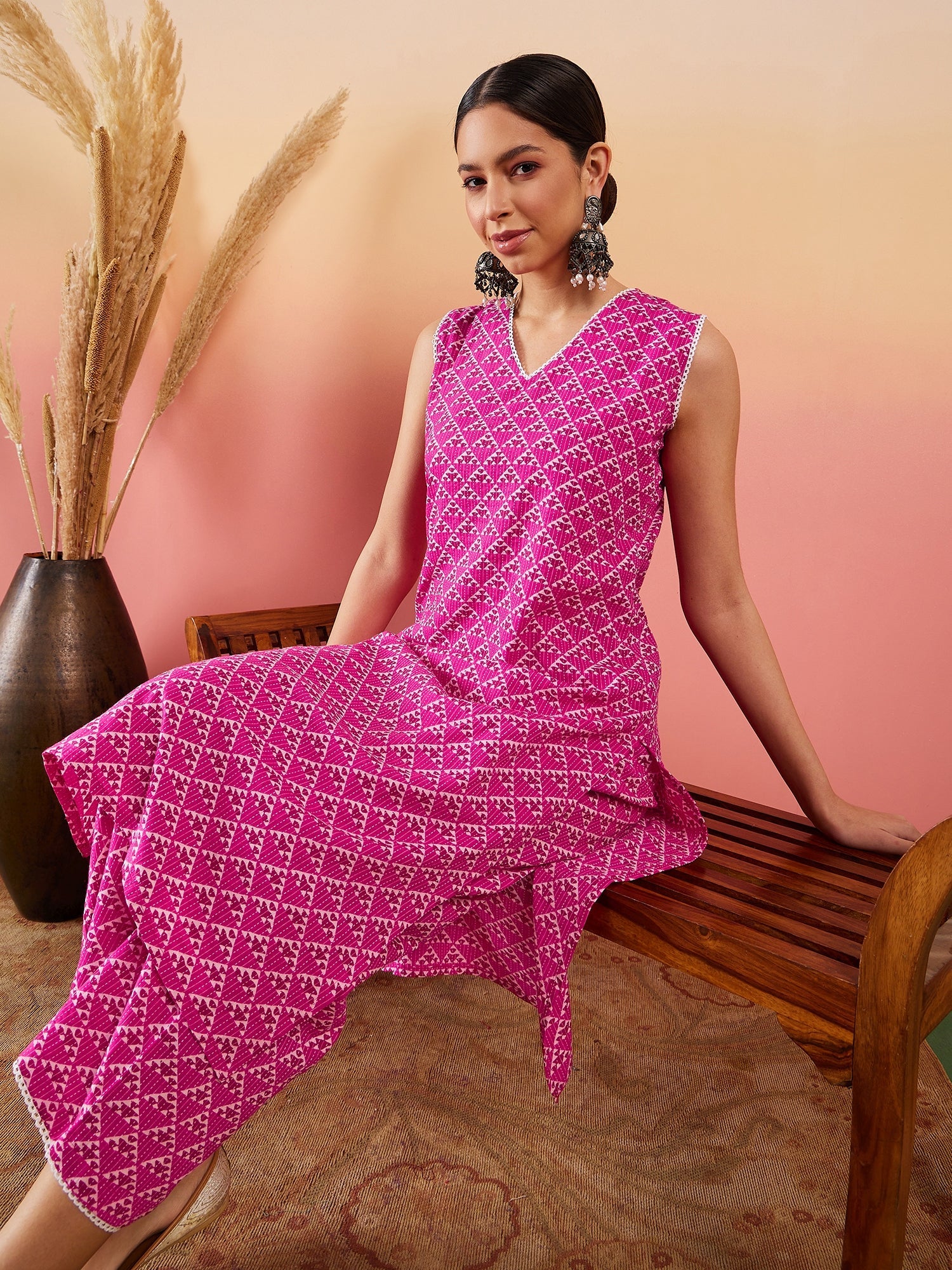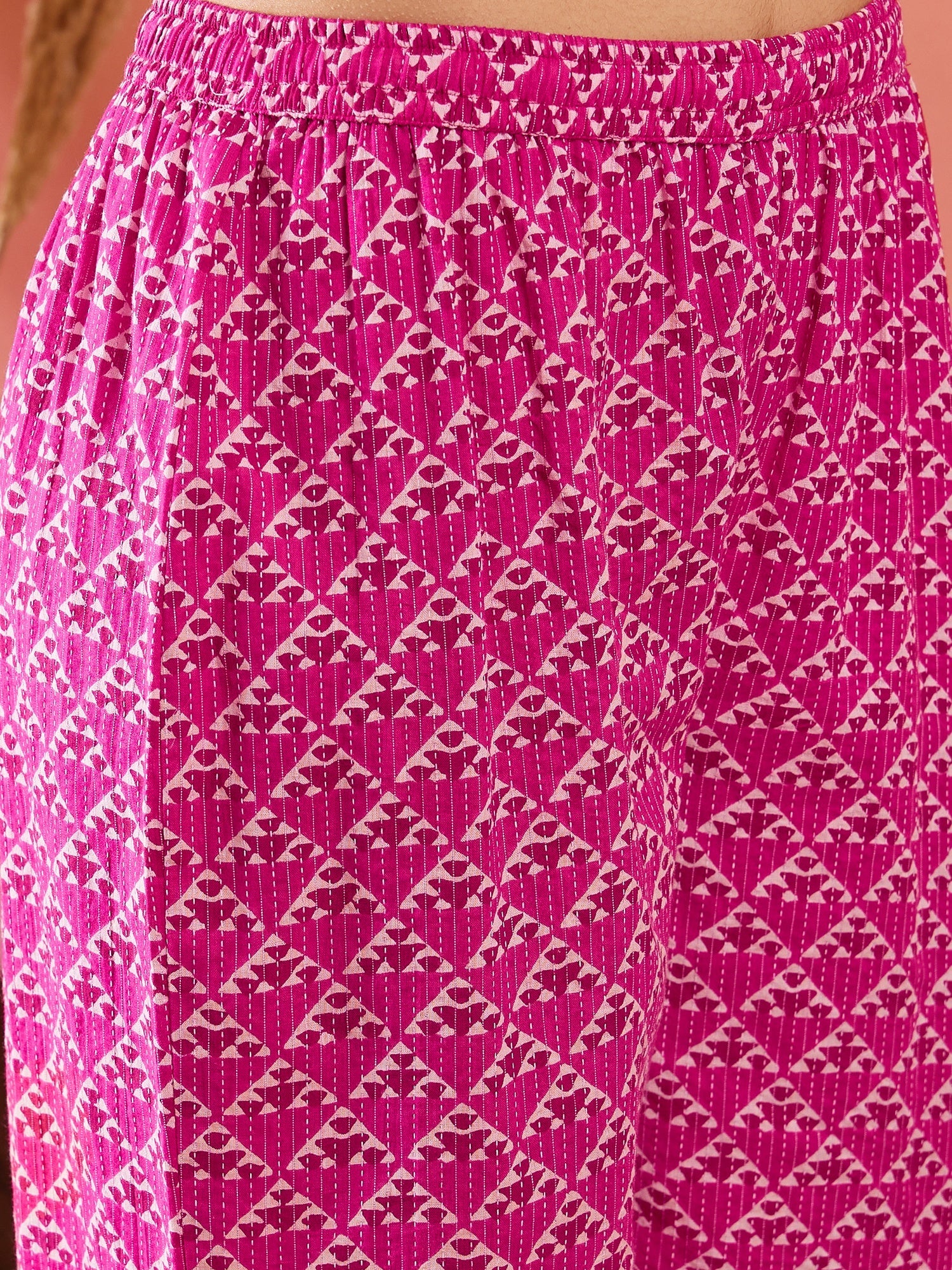 InWeave Pink Pyramid Kantha V Neck Lace Work Kurta Palazzo SetThe Set is crafted from best of Indian fabrics. Style it with Oxidised jewelery and j...