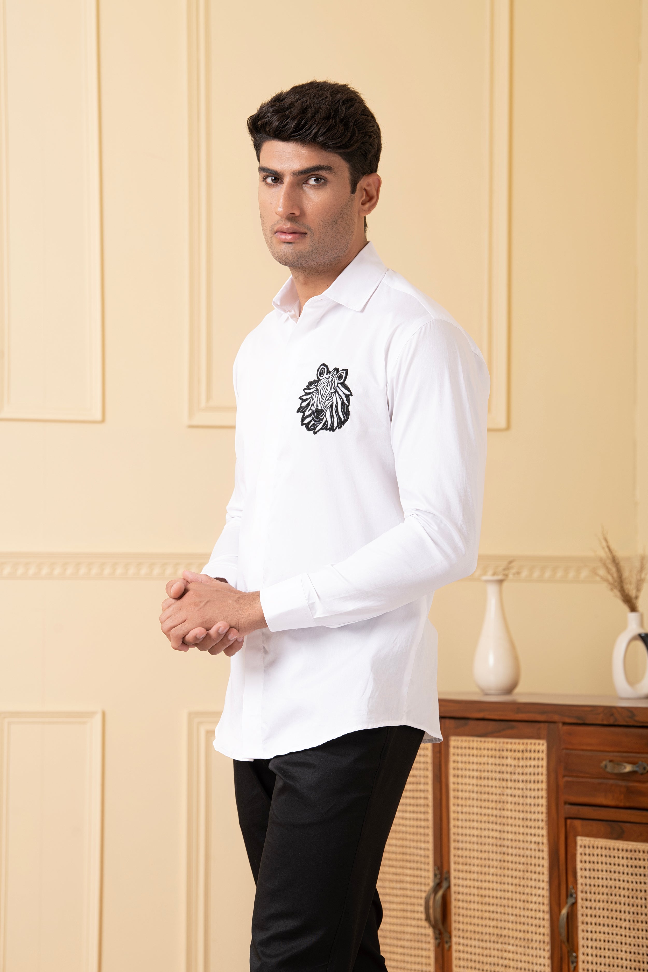 This this unique piece that features a meticulously crafted zebra embroidery. The concealed buttons not only offer a clean and sleek look but also enhance comfort. Stripedorn is more than just a shirt; it's a statement of individuality and elegance. Whether for formal occasions or casual outings,