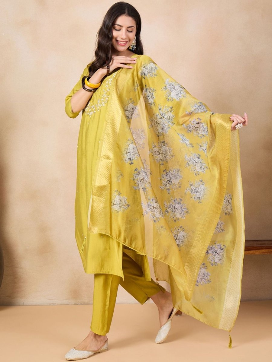 Anouk Yellow Floral Yoke Design Thread Work Chanderi Silk Kurta With Trousers & Dupatta - Distacart