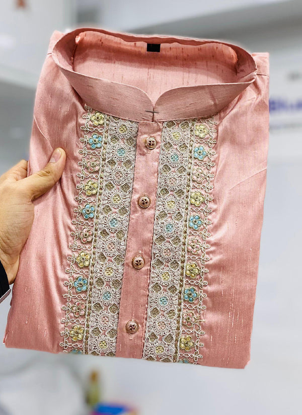 Prazu Fashion Baby Pink Shiny Silk Fabulous Coding Work Kurta With PajamaAbout the Product: GENDER : male Colour : Baby-Pink Work/Pattern : Codding...