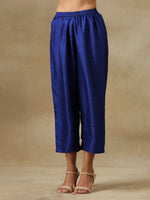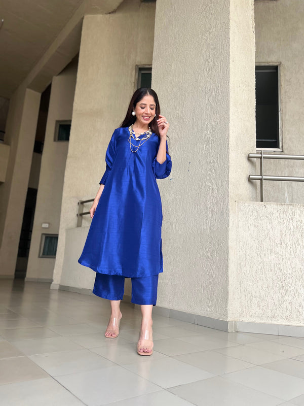 trueBrowns Blue Textured Silk Puff Sleeve Kurta Pant SetDescription Blue silk-blend v-neck kurta set with puff sleeve and neck gathers. Kurta also ...