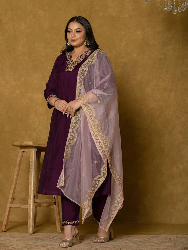 Yufta Purple Silk Embroidered Plus Size Kurta Dupatta Set