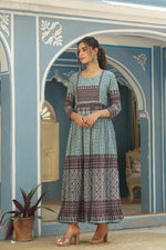 Juniper Sky Blue Muslin Festive Printed Flared Dress For Women Perfect For Fusion Clothing With A Traditional Twist, Trendy Silhouette And Latest Styles