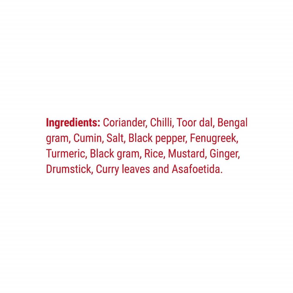 Rice, Toor Dhal, Coriander, Chili, Gram Dhal, Tamarind Powder, Shredded Coconut, Cumin, Asafetida, Pepper, Salt, Mustard, Onion Flakes, Fenugreek, Curry Leaf, Turmeric, Refined Groundnut Oil.