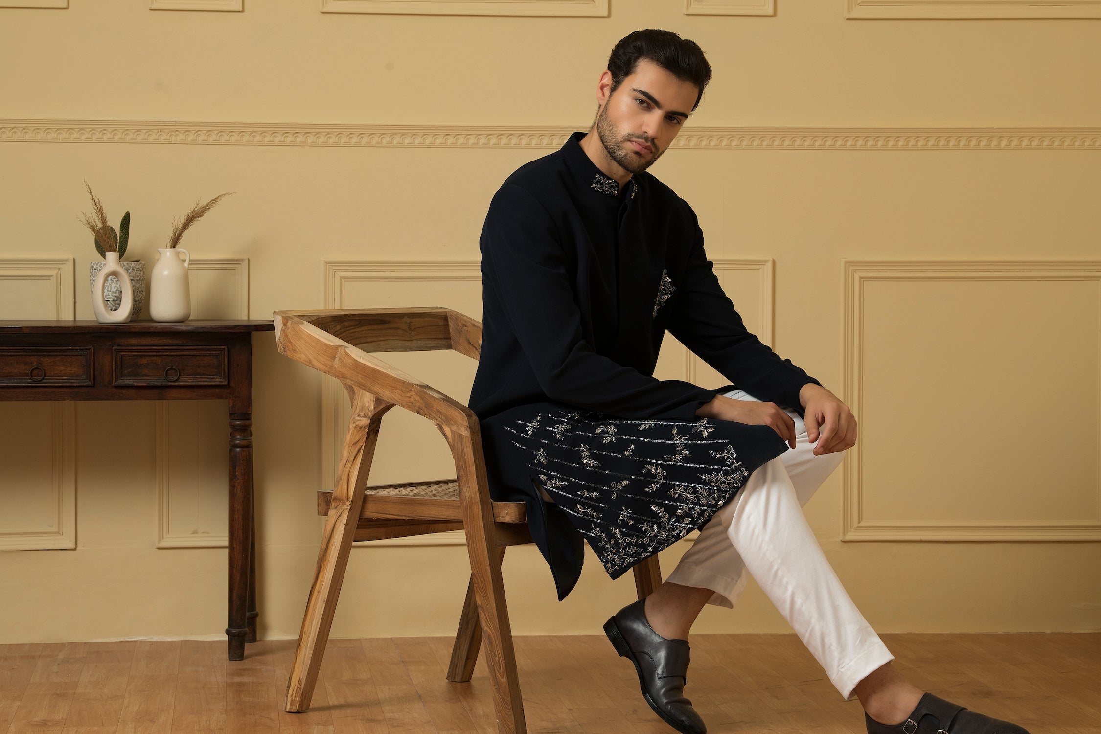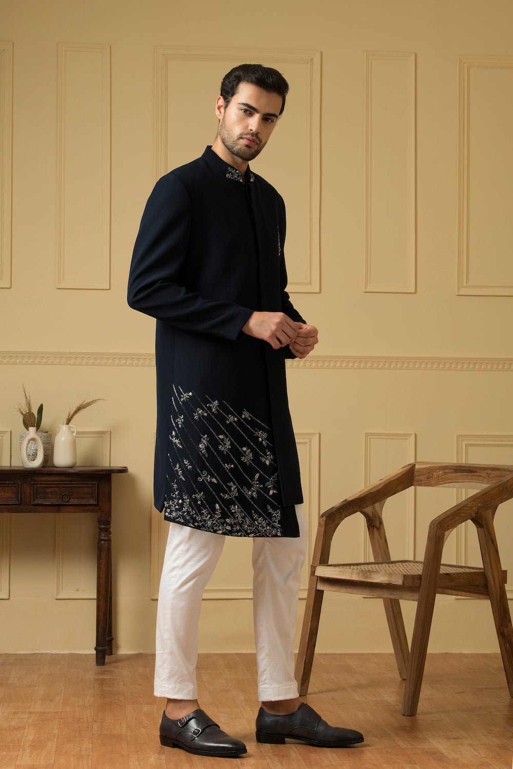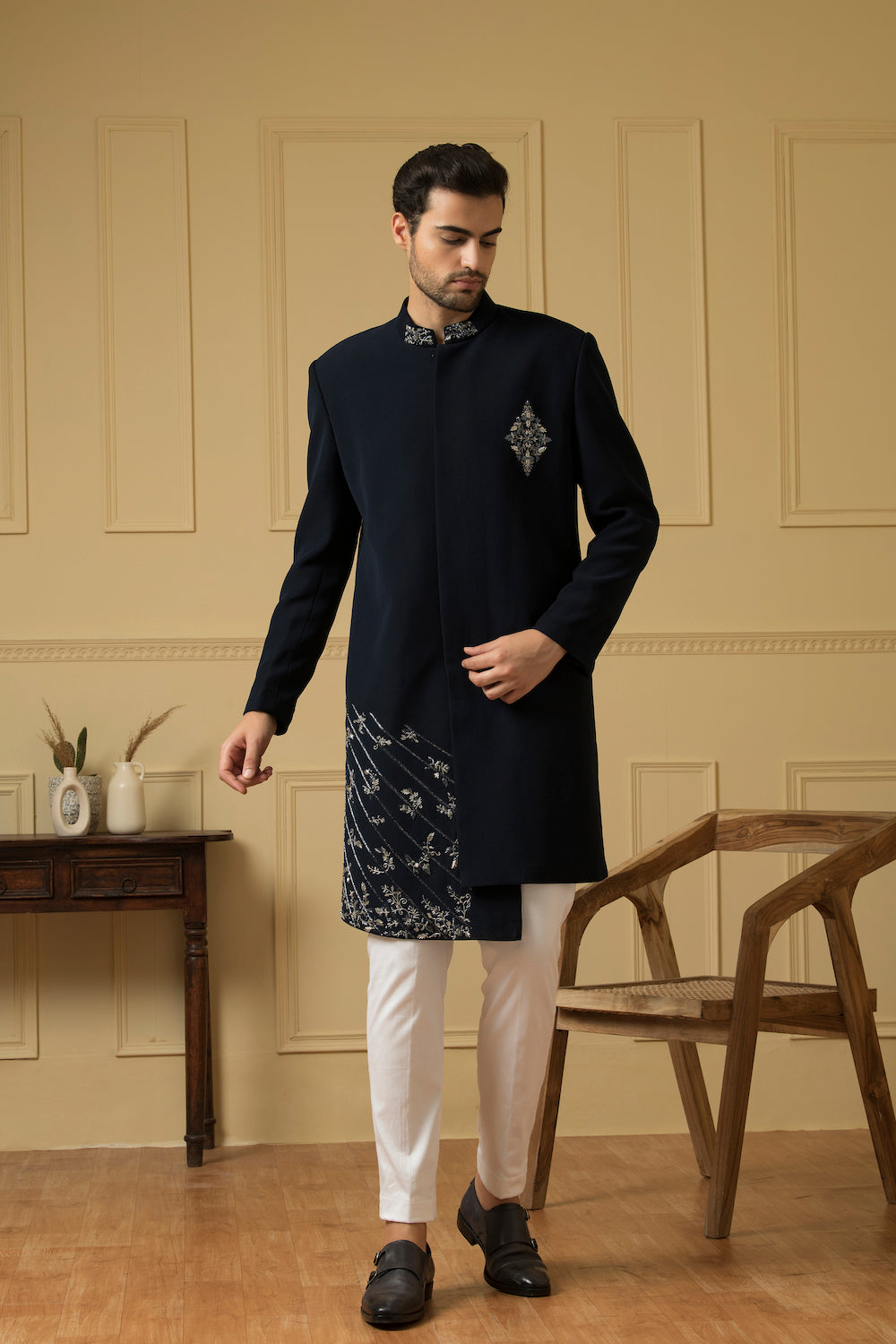 This exquisite attire is crafted with a self-textured fabric that adds depth and richness to its appearance. The hand embroidery, featuring silver and blue cut beads, creates a dazzling and eye-catching effect. The carefully positioned work and the motif on the left and up-down hem add a touch of artistic sophistication.