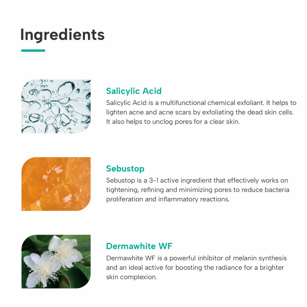 • Reduces sebum production: The serum is infused with ingredients that reduce and balance the sebum production on skin to prevent blackheads & whiteheads from occurring.