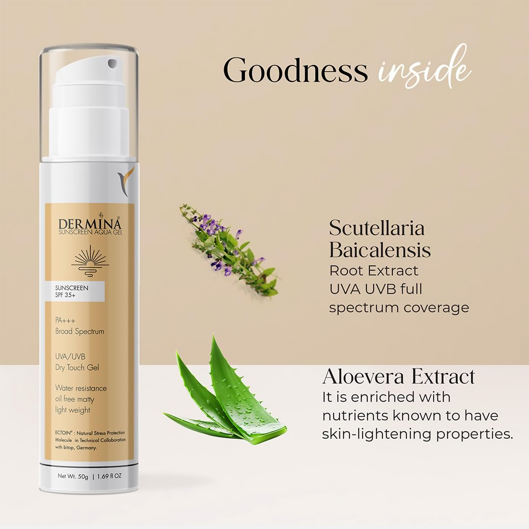 DERMINA Sunscreen Aqua Gel SPF 35+ PA+++ Broad Spectrum About the product:Dermina SPF35 Sunscreen PA+++ Broad Spectrum Sunscreen Aqua gel is Broad ...