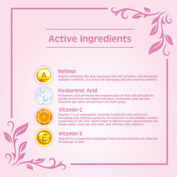 Retinol (0.3%): Retinol is a derivative of vitamin A and is known for its ability to promote cell turnover, stimulate collagen production, and reduce the appearance of wrinkles and fine lines. It can also improve skin texture and tone, making it an effective ingredient for anti-aging.