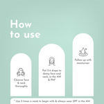 • Take 3-4 drops of face serum onto your palm, dab all over face and neck using gentle tapping motions.