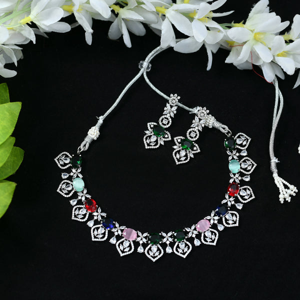 Mominos Fashion Johar Kamal Silver-Plated American Diamond Multi Colour Choker Set