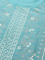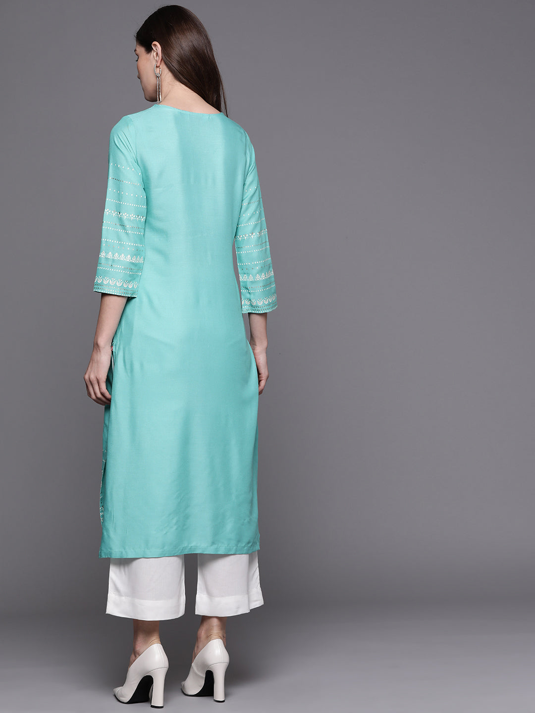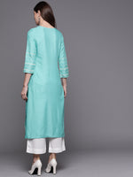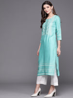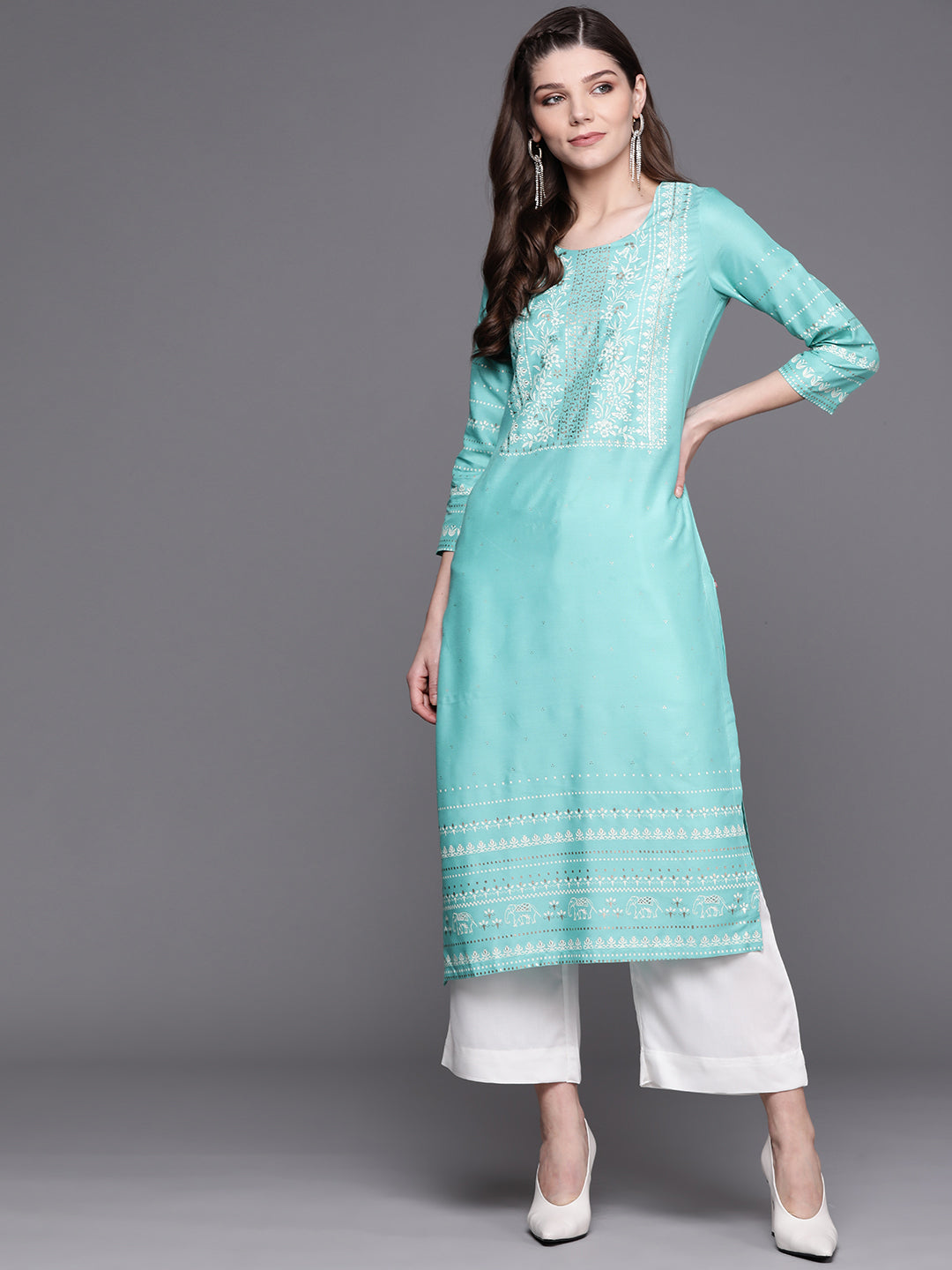Blue, white and golden ethnic print straight calf length kurta, has a round neck, three-quarter sleeves, straight hem, side slits