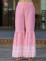 Juniper Women's Pink Chinnon Embroidered Kurta Garara SetPink Chinnon embroidered kurta with lace detailing, three fourth flared sleeve, round neck...