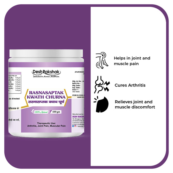 Desh Rakshak Rasnasaptak Kwath Churna Key Benefits- Beneficial in arthritis. Get relief in joint pain. Provides comfort in muscular pain. Key Ing...