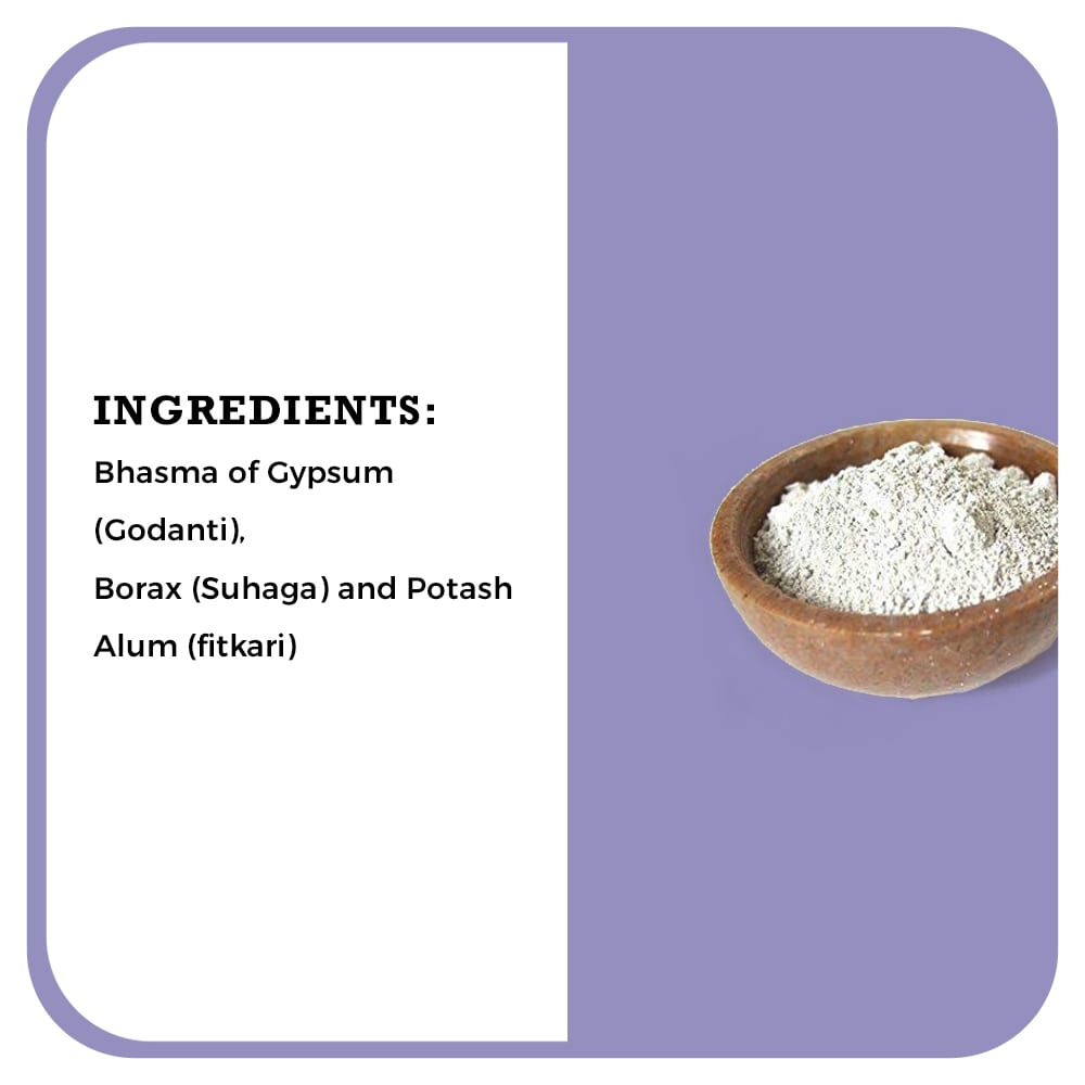 Key Ingredients: Bhasma of Gypsum (Godanti), Borax (Suhaga) and Potash Alum (fitkari)