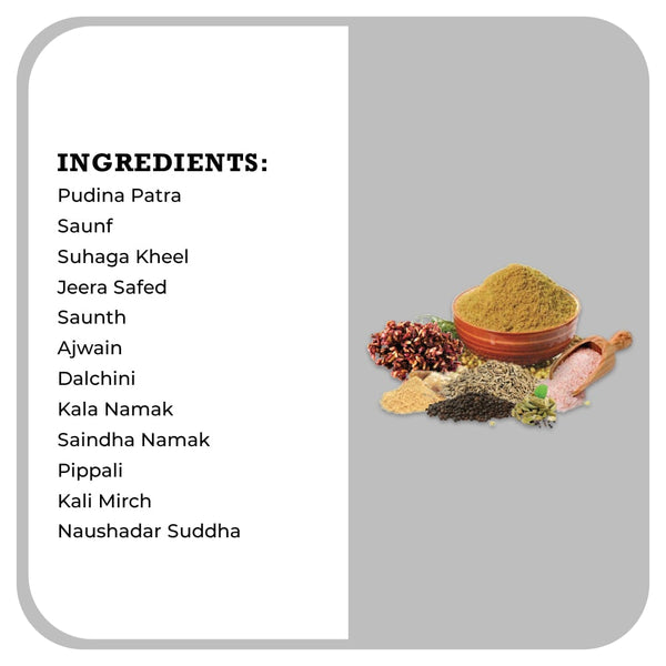 Key Ingredients: Pudina Patra, Saunf, Suhaga Kheel, Jeera Safed, Saunth, Ajwain, Dalchini, Kala Namak, Saindha Namak, Pippali, Kali Mirch, Naushadar Suddha