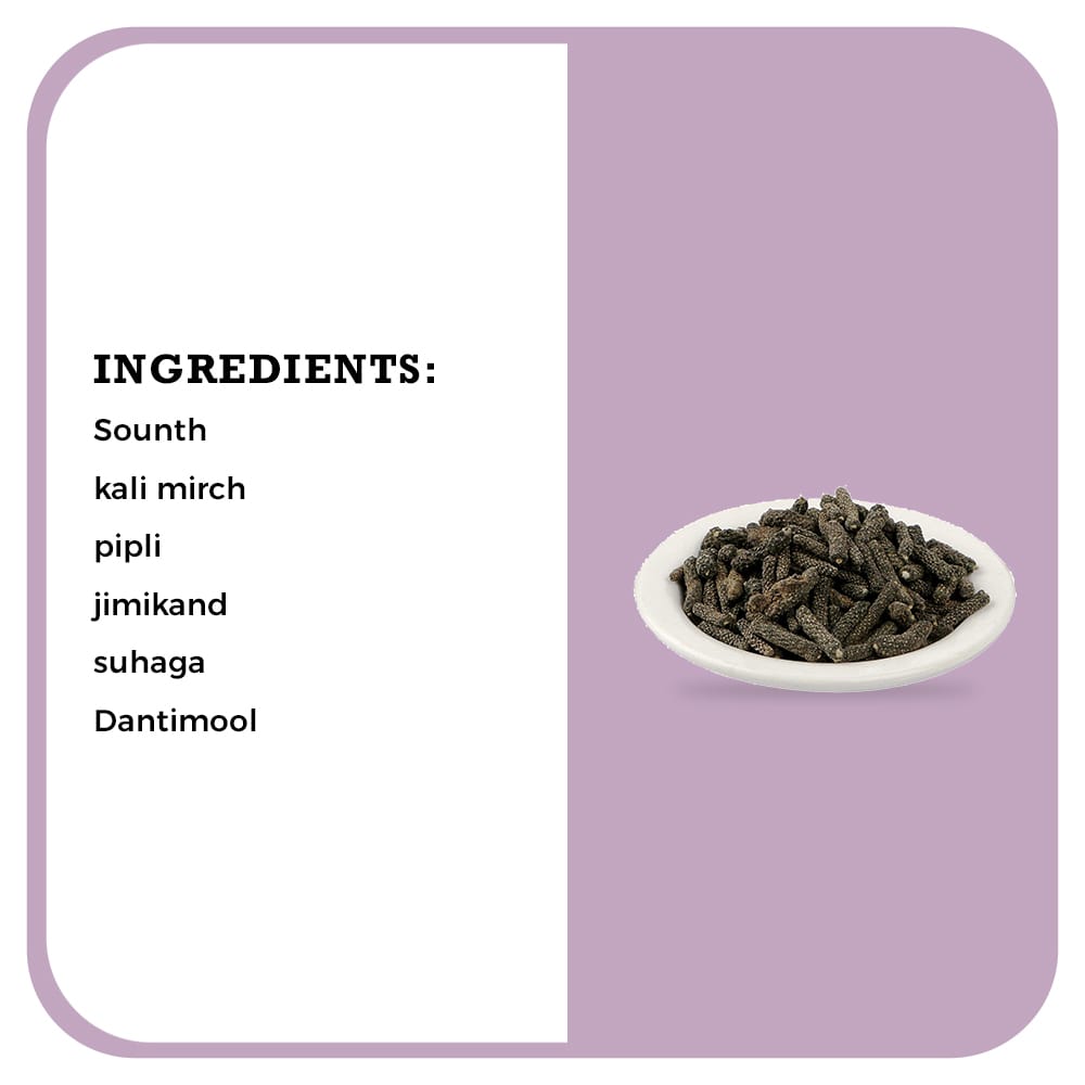 Key Ingredients- Kajjali, Lauha Bhasma, Shunthi, Tamra Bhasma, Danti Mool, Marica, Pippali, Surana, Vamsha, Shuddha Tankana, Yavakshar, Saindhava Lavana.