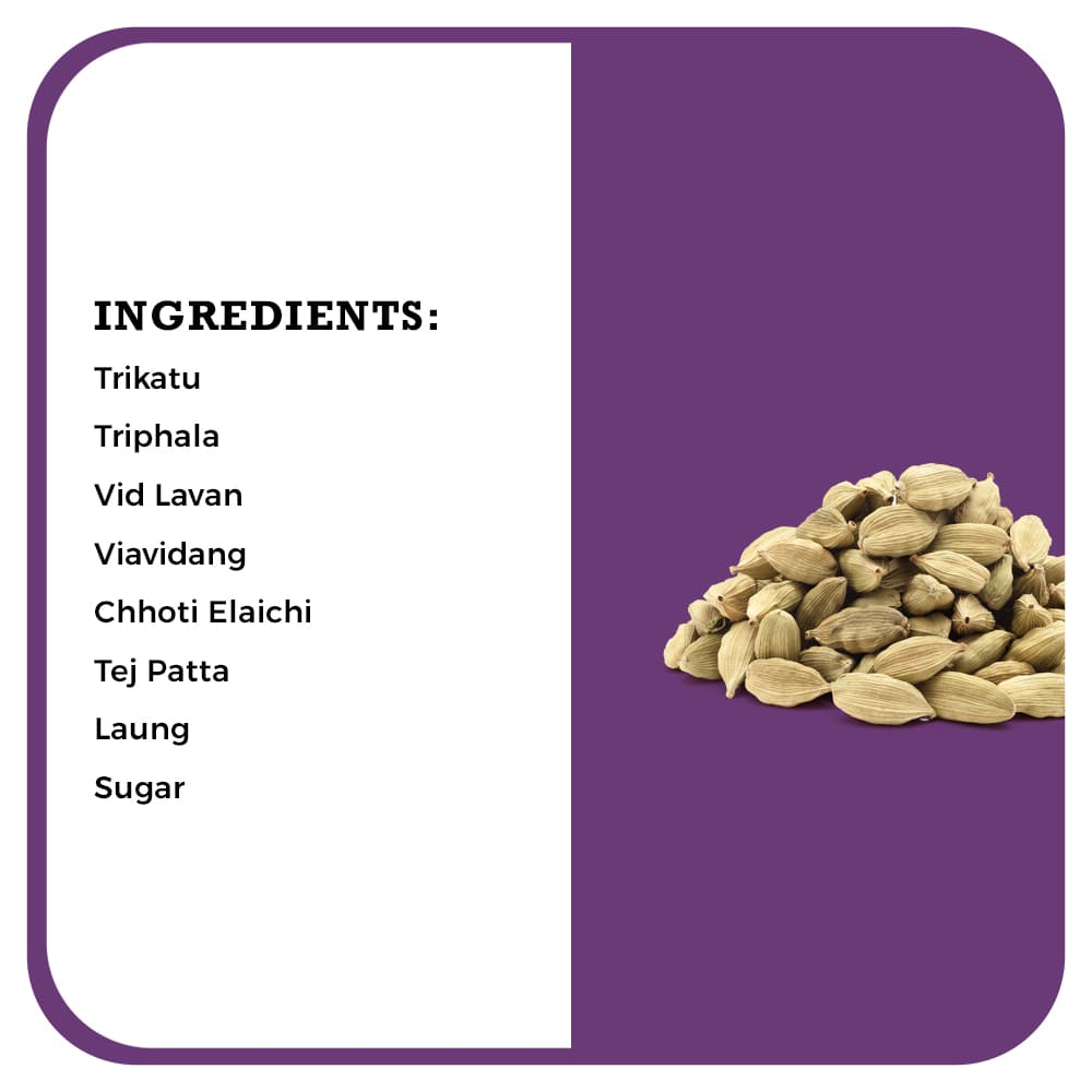 Key Ingredients– Trikatu, Triphala, Nagarmotha, Vid Lavan, Viavidang, Chhoti Elaichi, Tej Patta, Laung, Nisoth, Sugar.