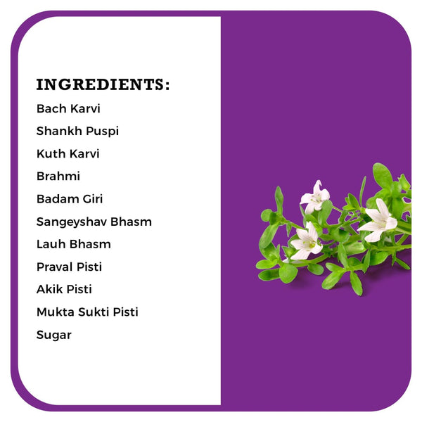 Key Ingredients– Bach Karvi, Shankh Puspi, Kuth Karvi, Brahmi, Badam Giri, Sangeyshav Bhasm, Lauh Bhasm, Praval Pisti, Akik Pisti, Mukta Sukti Pisti, Sugar