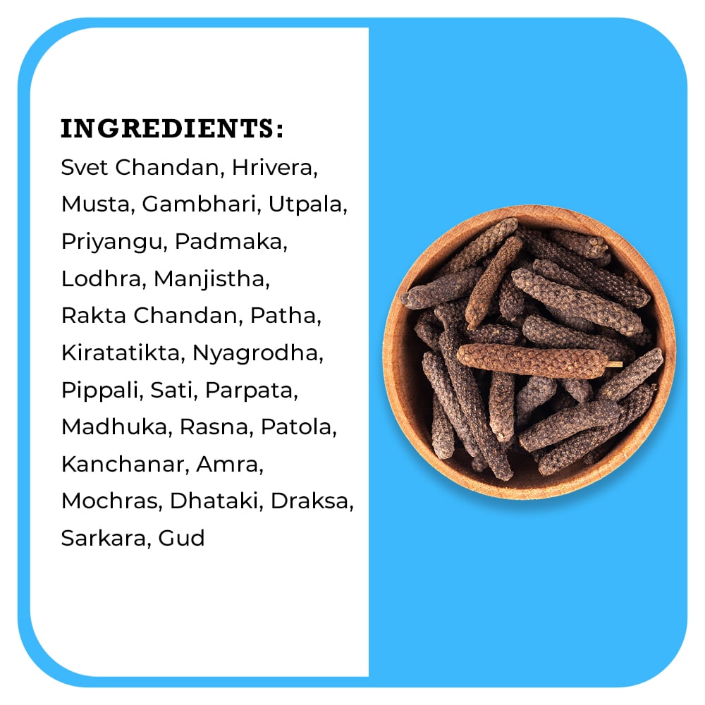 Key Ingredients: Svet Chandan, Hrivera, Musta, Gambhari, Utpala, Priyangu, Padmaka, Lodhra, Manjistha, Rakta Chandan, Patha, Kiratatikta, Nyagrodha, Pippali, Sati, Parpata, Madhuka, Rasna, Patola, Kanchanar, Amra, Mochras, Dhataki, Draksa, Sarkara, Gud.