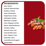 Key Ingredients– CP, Vaca, Musta, Bhuminimba, Guduchi, Devdaru, Haridra, Ativis, Daruharidra, Pippalimula, Citrak, Dhaniya, Haritak, Bhibhitak, Amalaki, Cavya, Vidanga, Gajpippali, Sunthi, Marica, Pippali, Makshik Bhasma, Yavakshar, Sarjikshar, Saindha Lavana, Saurvacal Lavana, Vid Lavana, Trivrt, Danti, Tejpatra, Tvak, Suksmalia, Vamsa, Lauha Bhasma, Sita, Silajatu, Guggul